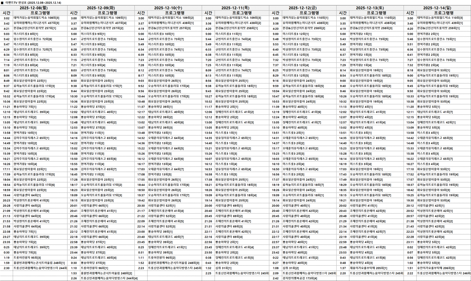 2025년 12월 1일~2025년 12월 7일 주간편성표
