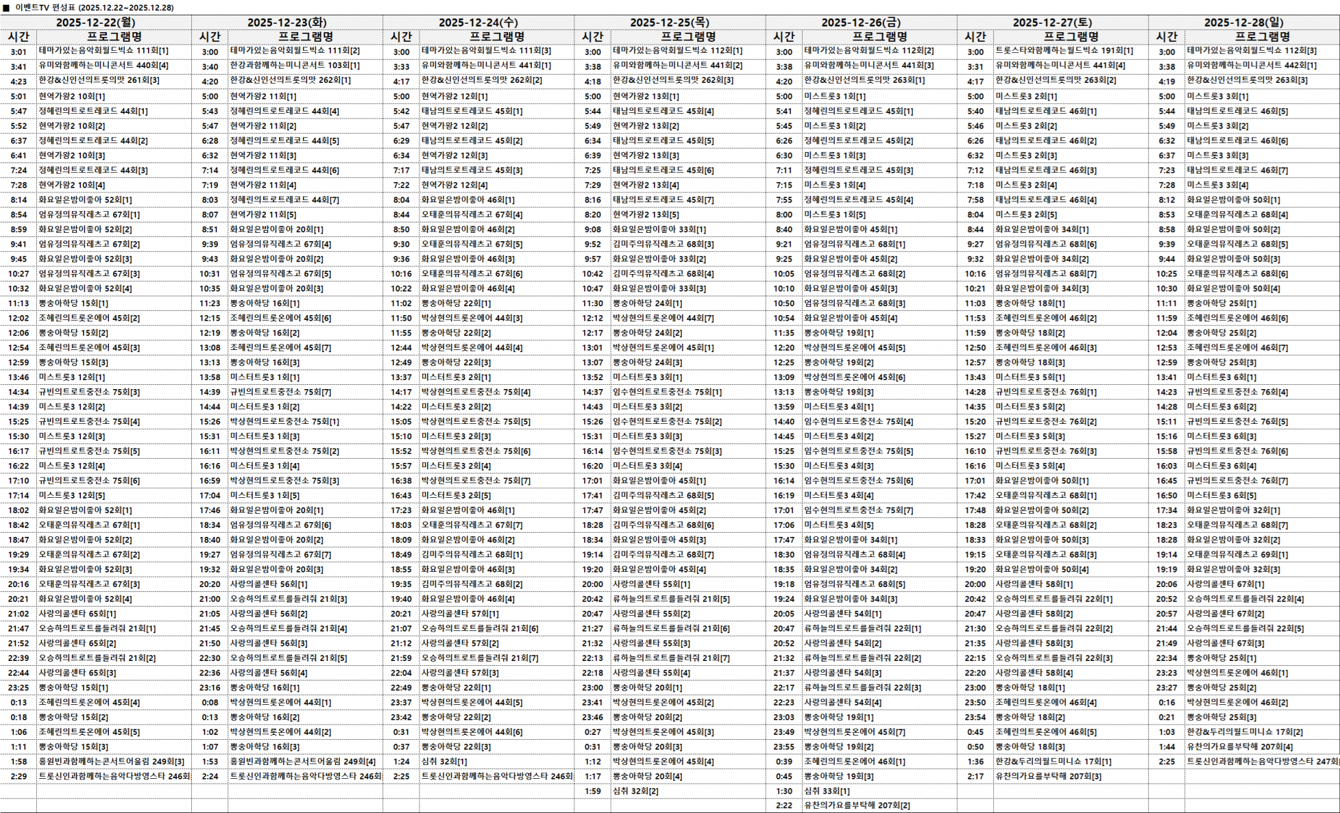 2025년 12월 22일~2025년 12월 28일 주간편성표