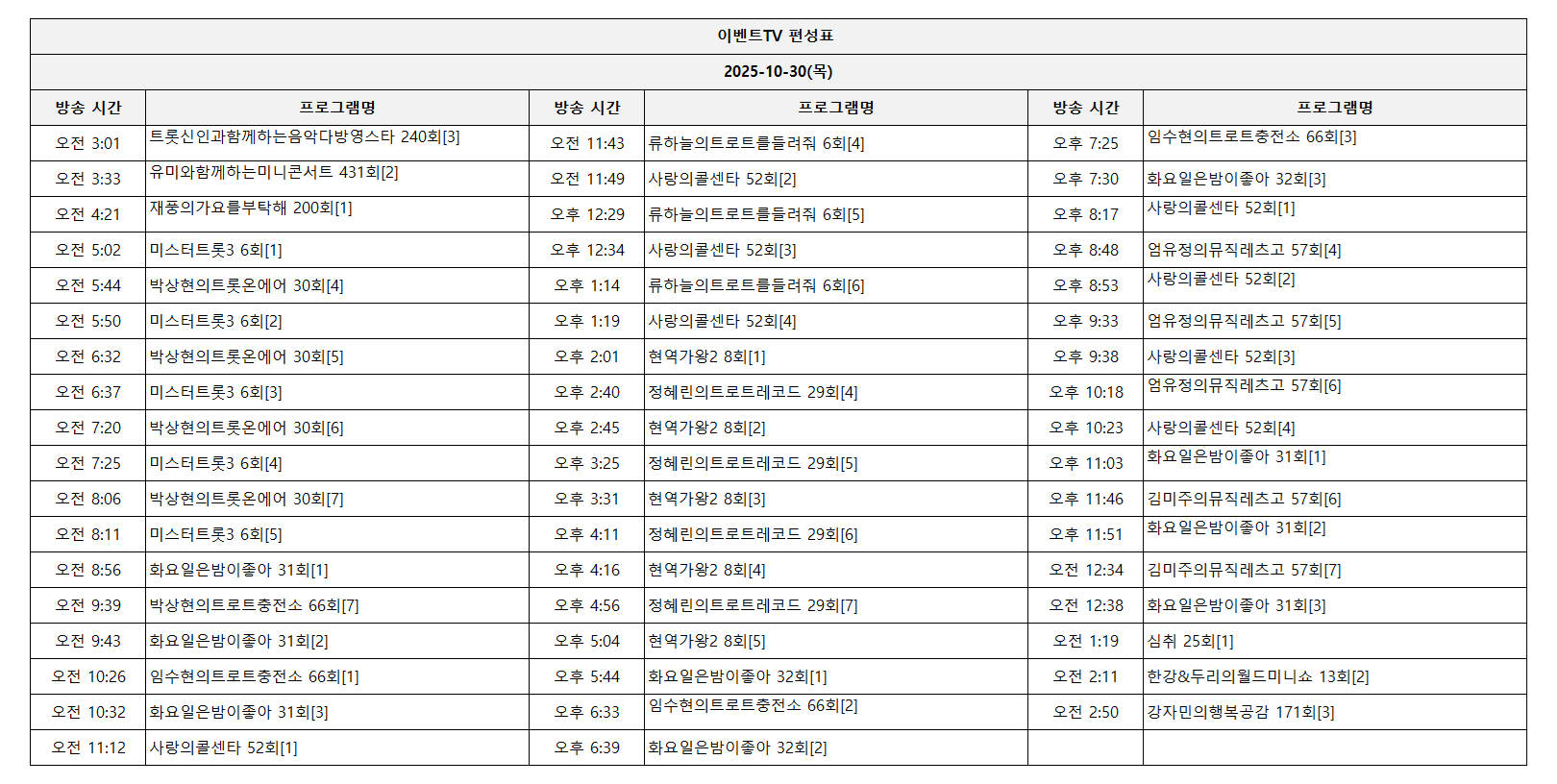 2025-10-30(목) 일일 편성표