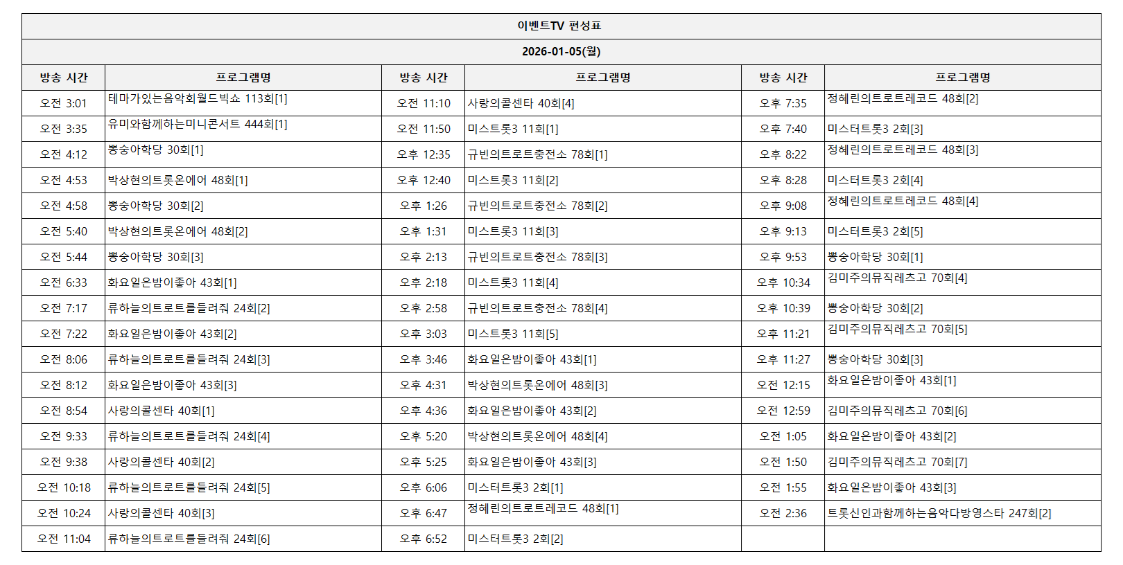 2026-01-05(월) 일일 편성표