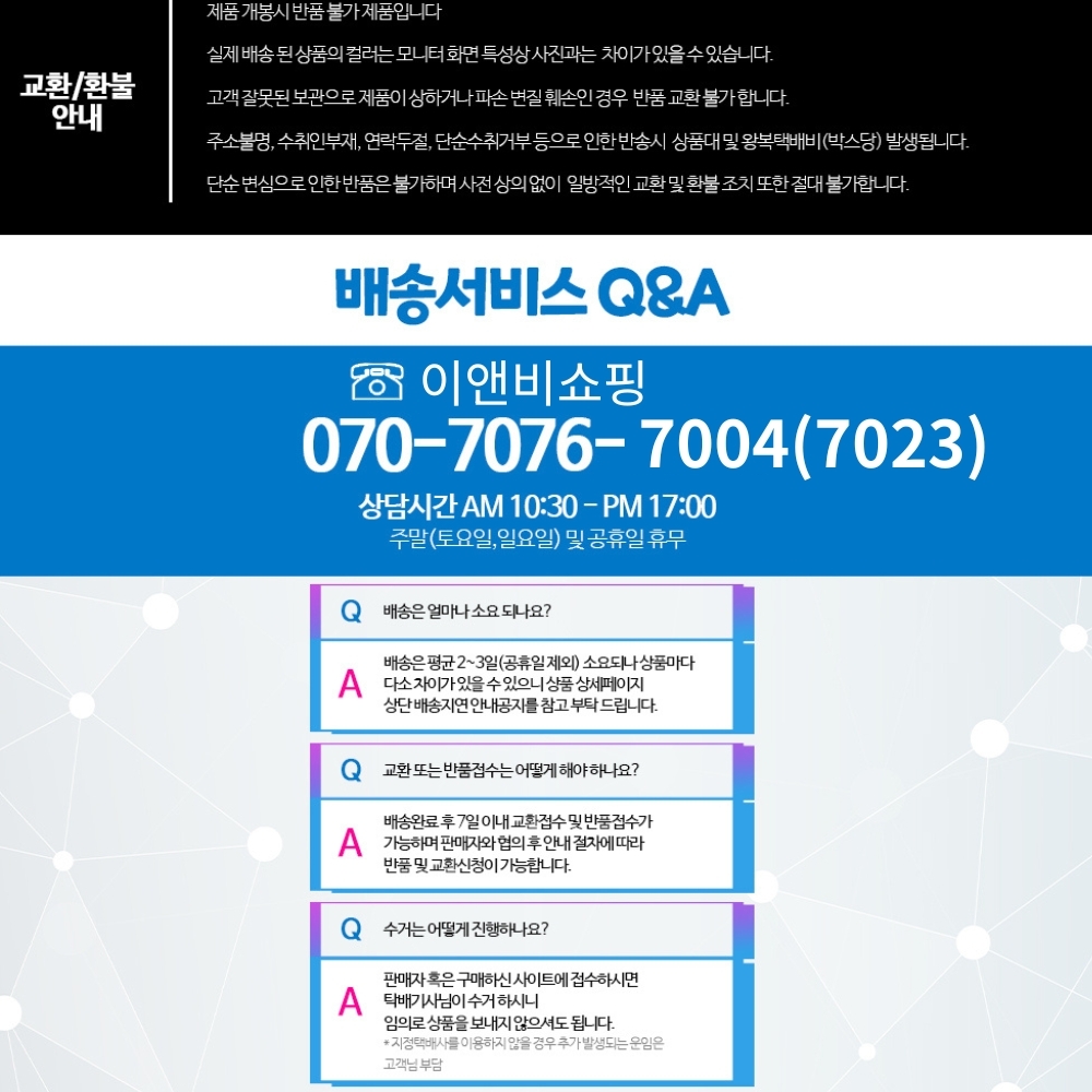 - 고객 변심으로 인한 교환/반품은 상품 수령 후 7일 이내 가능합니다.